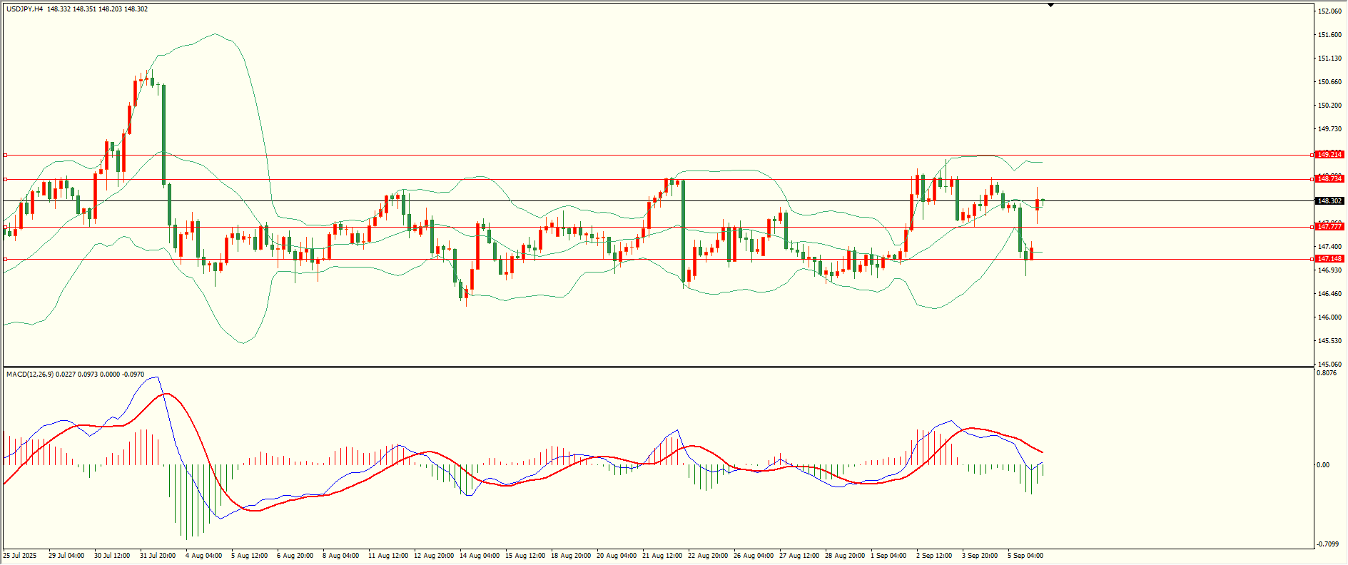 美日上周五小幅反弹后承压下行,盘中失守第二支撑后续创日内新低,日线报收中阴线,总体来看,日线的多空震荡格局尚未结束,短线谨慎追涨杀跌,从4H来看,布林中轨拐头向下,MACD零轴附近运行,日内上方首要阻力148.70,第二阻力149.20,下方支撑147.75,147.15,保持在第一阻力下方短线有望回测第一支撑。 黄金:XAUUSD